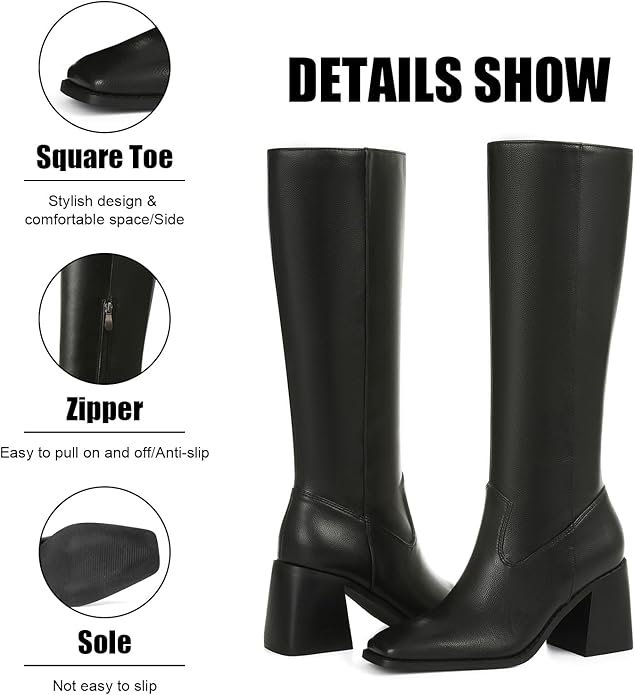 VOMIRA Knee High Boots Women Wide Calf Boots for Women Square Toe Tall Boots Chunky Heel Leather Long Boots Winter Fall Boots Black Boots for Women